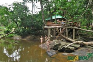 Trek je jungle kleding aan, want het is tijd om de Fredberg te trotseren. Je loopt in ongeveer 3 á 4 uur door de ongerepte jungle, voordat je de bergtop bereikt. Het is een tocht die voor een ieder in normale conditie goed te doen is. Aangekomen op de top van de berg is het genieten geblazen. Het uitzicht is prachtig en met een keuken en klein slaapkamp (met hangmatten) zijn de broodnodige faciliteiten voor een goede nacht ook aanwezig. Geniet van de zonsondergang en de sterrenhemel op de top van de berg, voordat je gaat slapen op deze bijzondere plek.