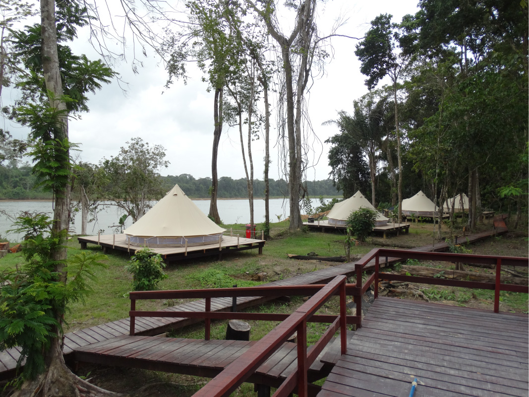 Slapen doe je comfortabel in onze iconische ruime tipi tenten. De tenten zijn hip ingericht en voorzien van twee bedden (drie bedden zijn mogelijk op aanvraag). De tenten staan op een houten plateau en elke tent beschikt over een eigen terras. Je waant je in een hotelkamer als je wakker wordt met uitzicht op de Surinamerivier.